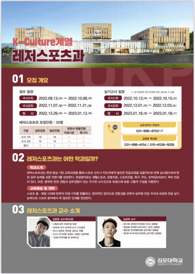 김포대학교 레져스포츠학과 수시 1차모집을 시작합니다